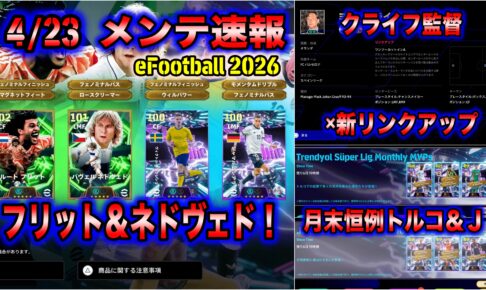 【メンテ明け】【eFootball 2026】4/23 メンテ速報:フェノフィニマグネット・フリット&フェノパロースク・ネドヴェド!ワンツー系新リンクアップ・クライフ監督登場!