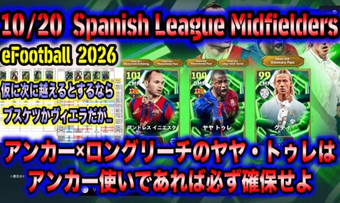 【eFootball】10/20 Spanish League Midfielders:脚長ロングリーチ搭載アンカー・ヤヤ・トゥレは、アンカー使いならたとえ1点狙いでも確保せよ!イニエスタ、グティは…