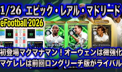 【eFootball 2026】1/26 エピック R・マドリー:マケレレは前回ロングリーチ版と天秤に。オーウェンは微強化+アクバ。新登場マクマナマンはカカと比較