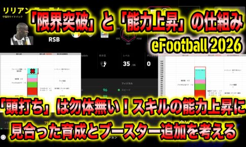 【eFootball 2026】「限界突破」と「能力上昇」の仕組み:「上限アップ」限界突破のブースター。スキルや調子など「見えない上昇分」を加味した育成を