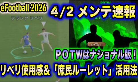 【随時更新】【eFootball 2026】4/2 メンテ速報:フェーズ更新日!ガチャは?POTWはナショナル版&ゴール動画「リベリ使用感」「スキルなし『庶民ルーレット』の活用法」