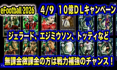 【eFootball 2026】4/9 10億DLキャンペーン:ジェラード、エジミウソン、トッティなど、無課金なら戦力になり得る選手が結構いるぞ!必ず20回以上引くように