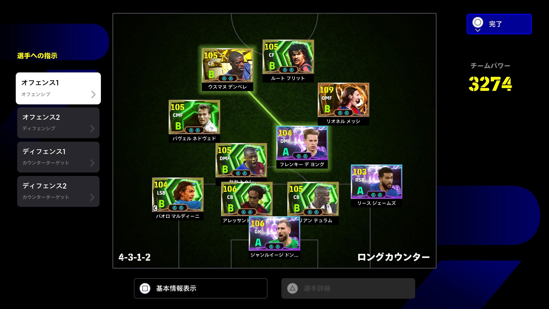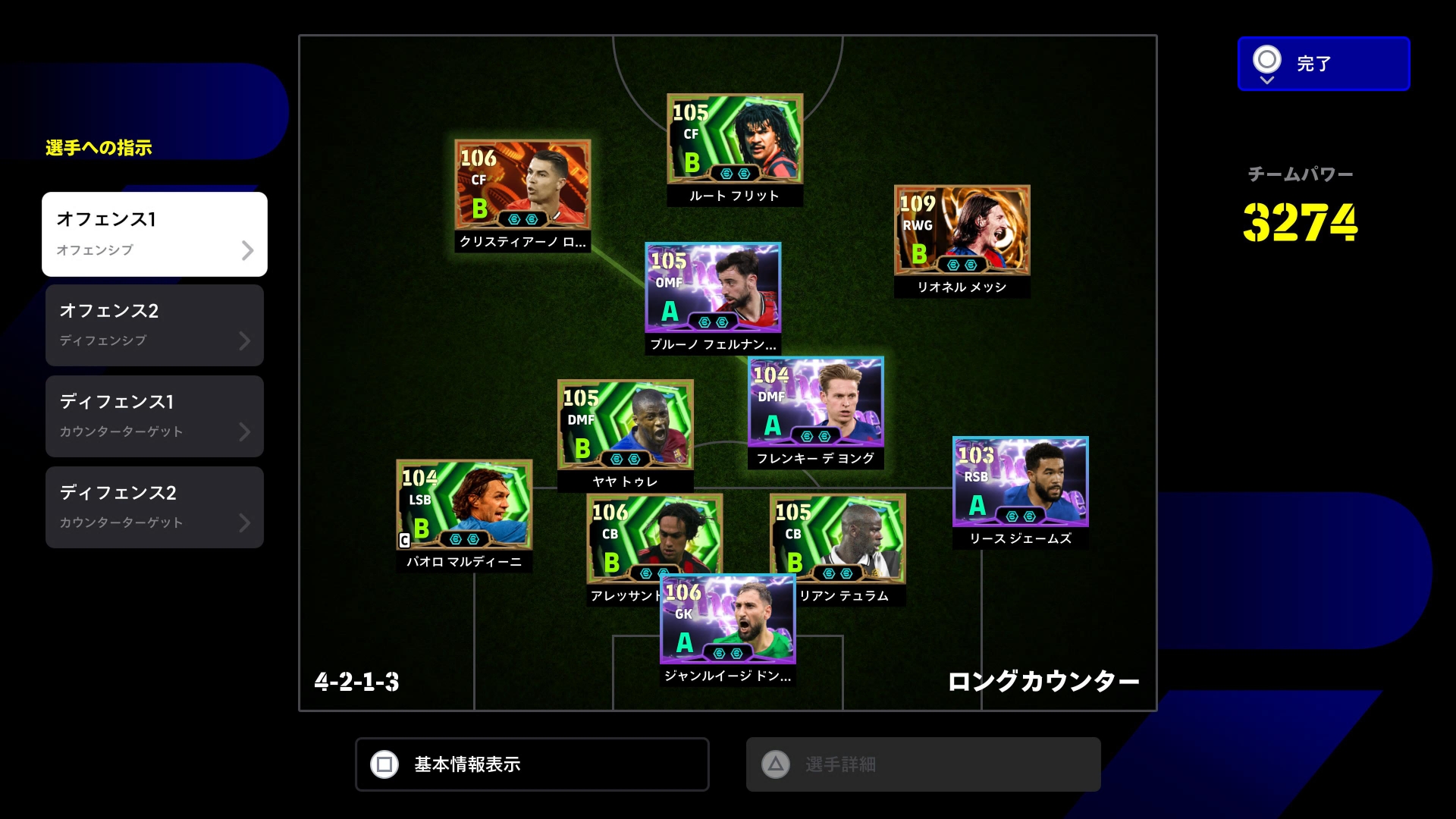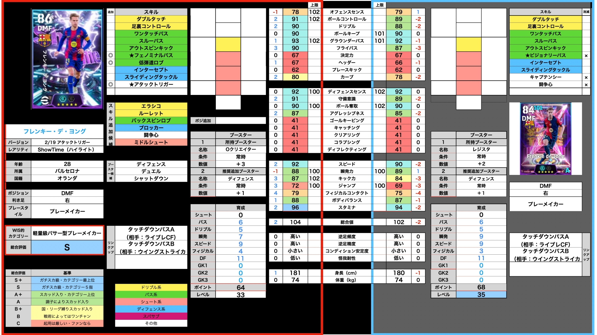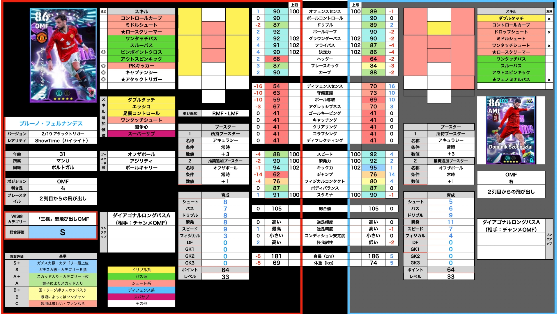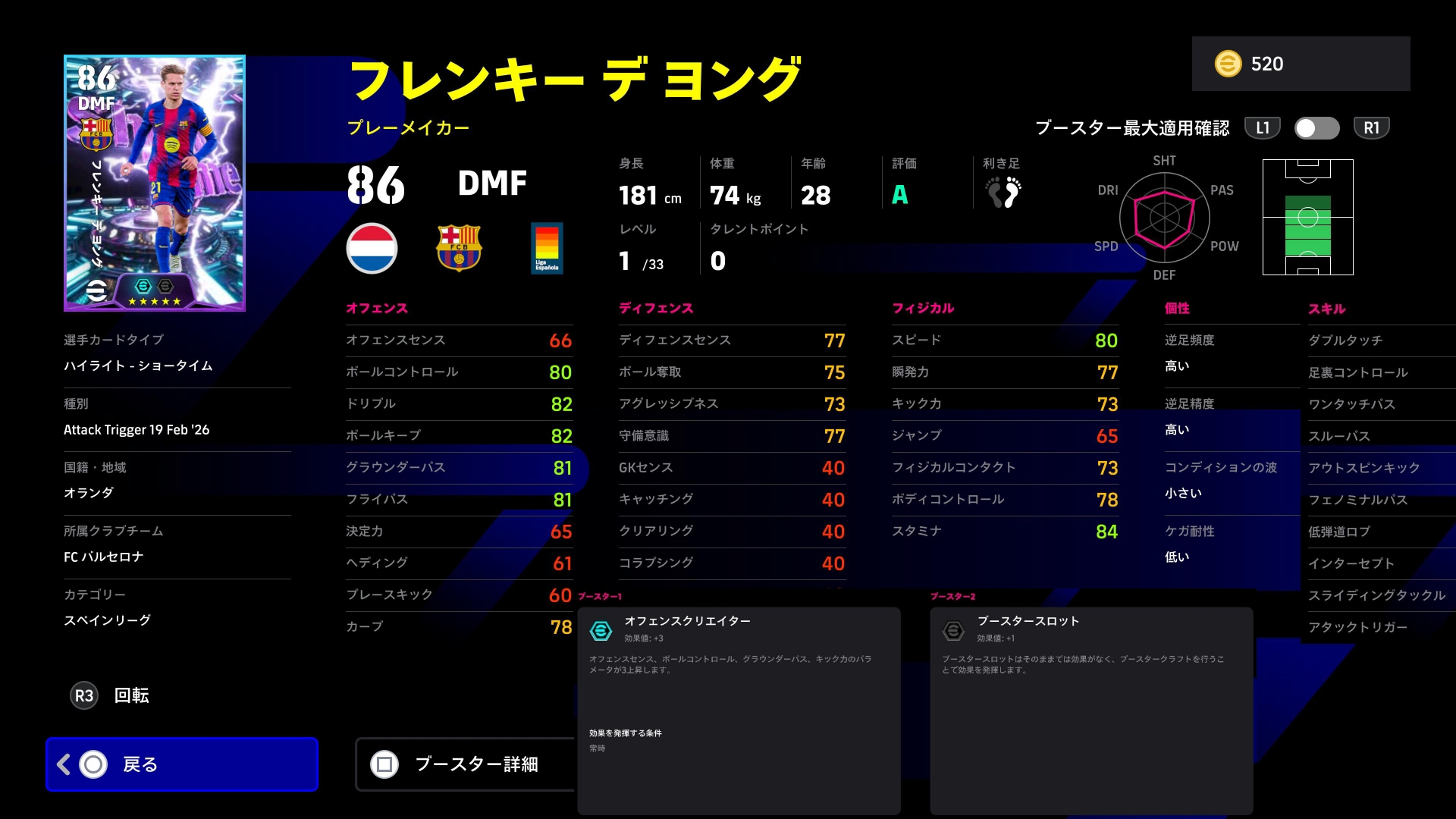 守備力とドリブル、パスを90乗せ。
