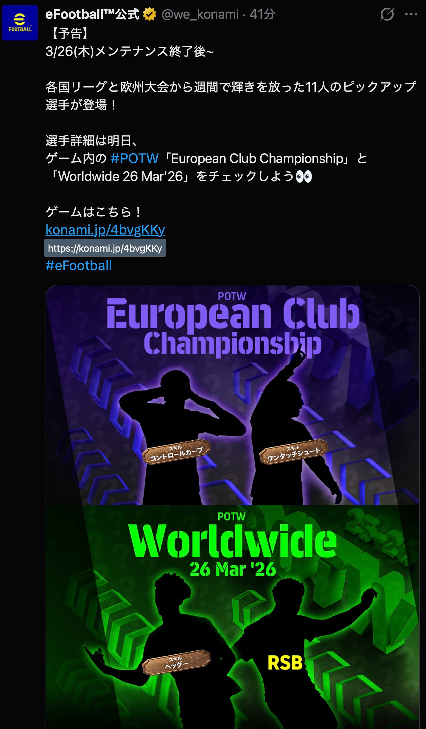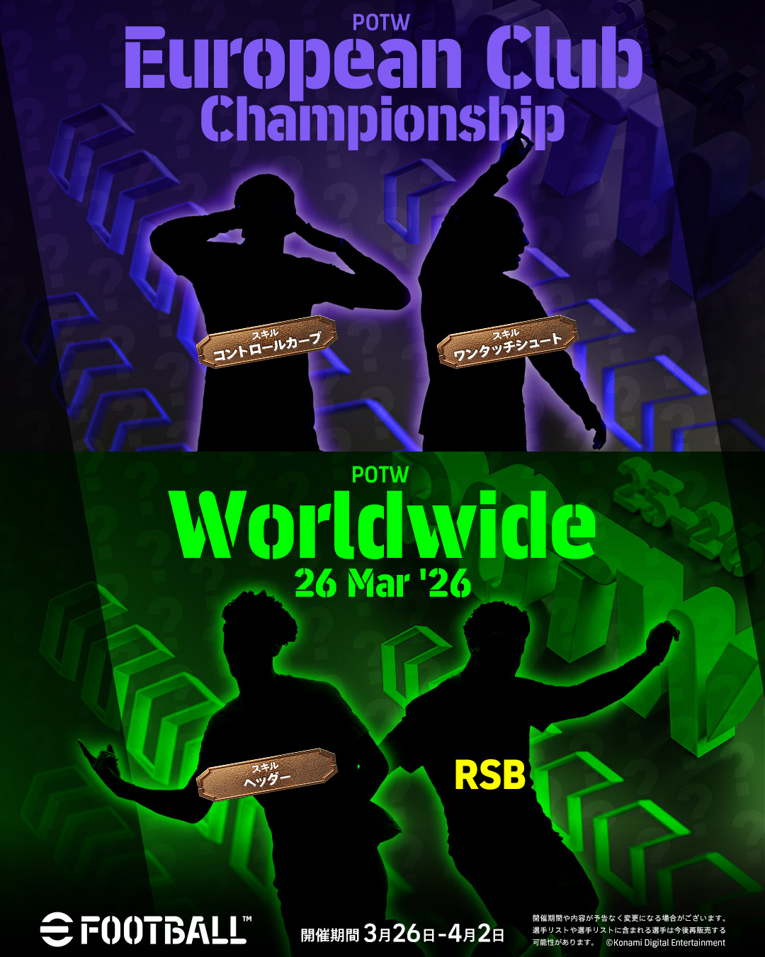 ゲーム内の #POTW「European Club Championship」と「Worldwide 26 Mar'26」をチェックしよう👀ゲームはこちら!https://t.co/1E1T5s1DVN#eFootball pic.twitter.com/m4a6WI2j1p