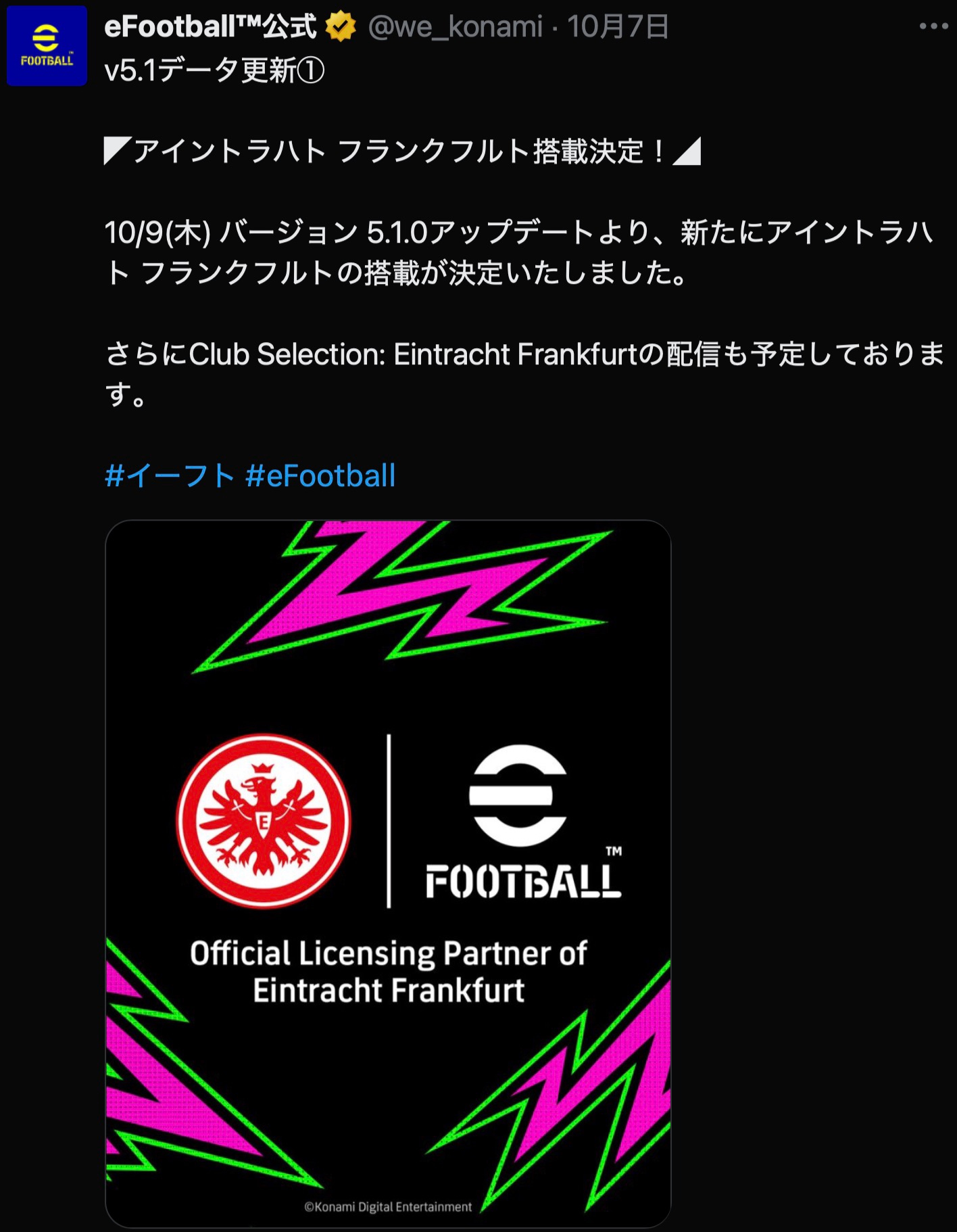 さらにClub Selection: Eintracht Frankfurtの配信も予定しております。#イーフト #eFootball pic.twitter.com/ZQ6txDRA35