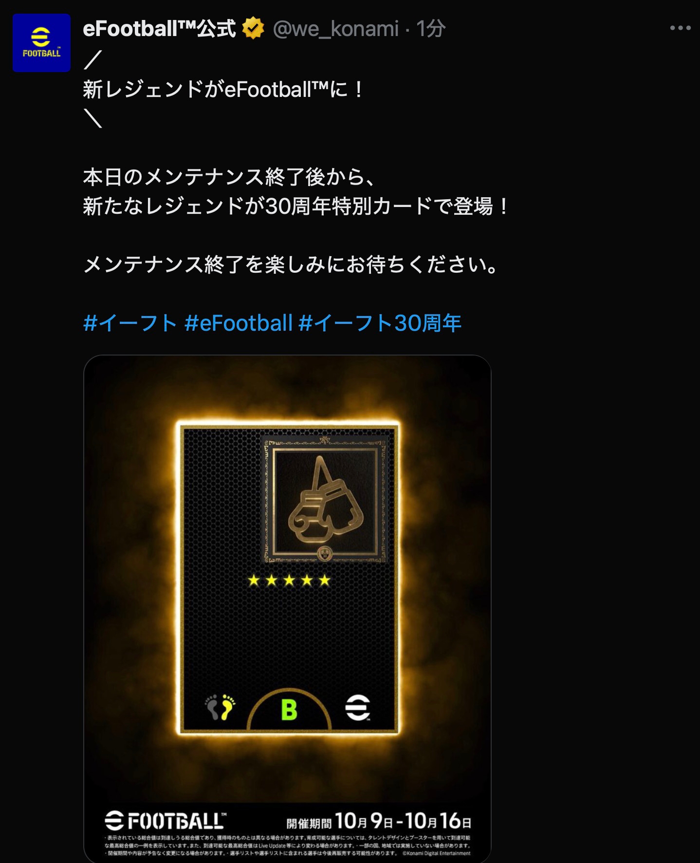 新たなレジェンドが30周年特別カードで登場!メンテナンス終了を楽しみにお待ちください。#イーフト #eFootball #イーフト30周年 pic.twitter.com/1pC0vUbKw3