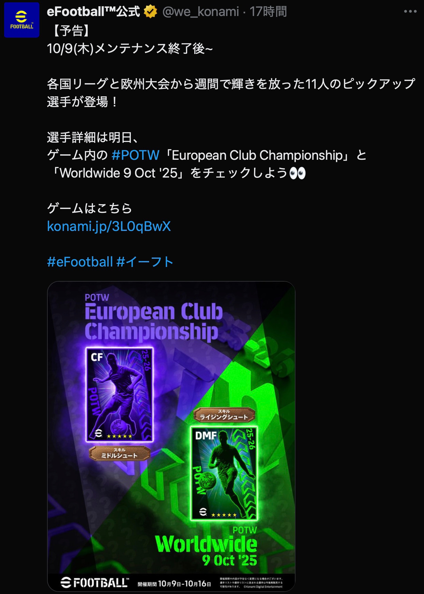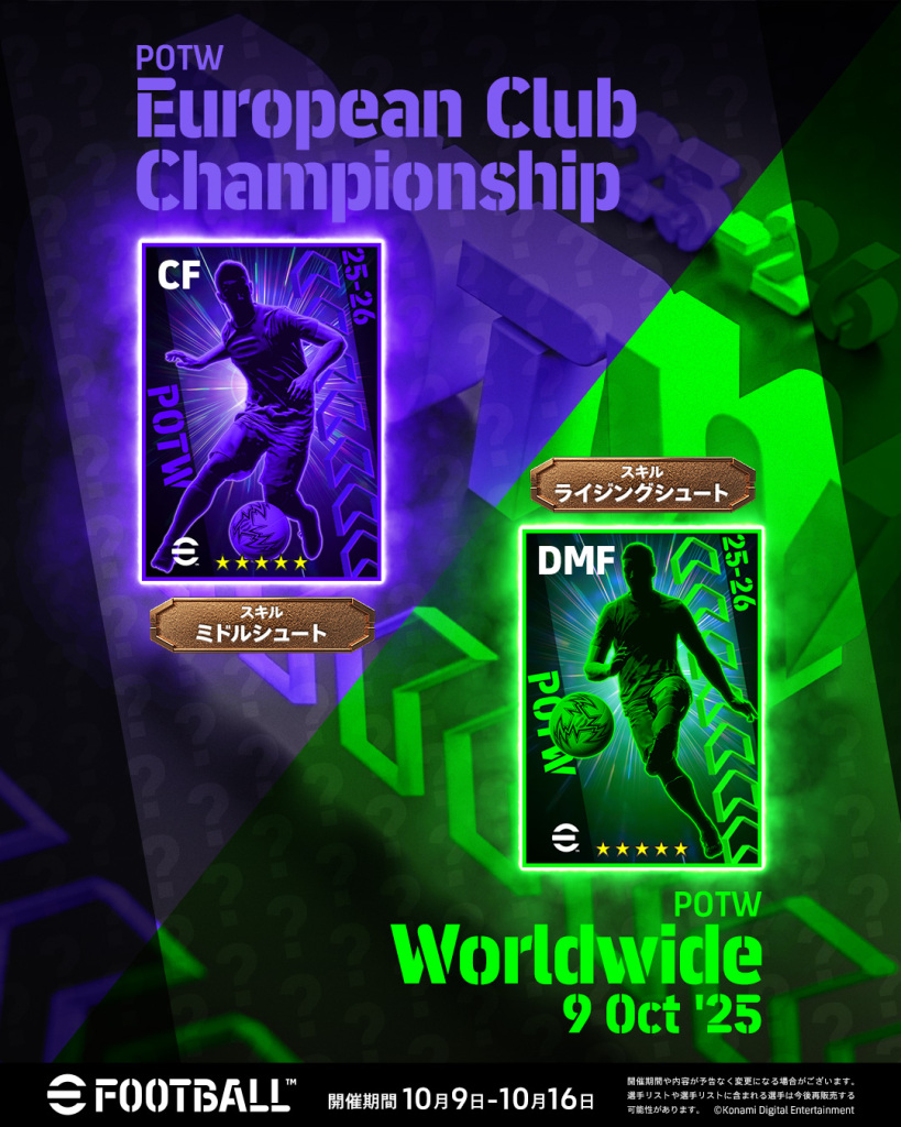 ゲーム内の #POTW「European Club Championship」と「Worldwide 9 Oct '25」をチェックしよう👀ゲームはこちらhttps://t.co/dkPIrcPLfs#eFootball #イーフト pic.twitter.com/FW1mPEJ6rW